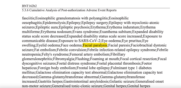 Court-ordered Pfizer documents present concerning findings regarding coronavirus vaccines. During the manufacturer’s clinical trials, physicians noticed test subjects experienced a plethora of complications. A dossier labeled 5.3.6 CUMULATIVE ANALYSIS OF POST-AUTHORIZATION ADVERSE EVENT REPORTS OF PF-07302048 (BNT162B2) RECEIVED THROUGH 28-FEB-2021, describes recipients experiencing various inoculation-induced maladies. One reaction listed is facial paralysis which affected 449 volunteers. Nearly 50% did not recover despite receiving treatment. The report states an additional 501 participants developed neurological disorders. Immunized individuals developing identical ailments are also described in the federal VAERS database: